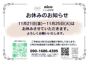 8月お盆休みのお知らせ 2025 8/03 お休みのお知らせ 2025年8月3日 いつもnico 小さな美容室をご利用いただきありがとうございます。2025年8月15日~19日まではお休みをいただきます。ご予約状況はInstagramにも更新しております。皆様のご来店お待ちしております。 NEWS TOPに戻る お休みのお知らせ よかったらシェアしてね! URLをコピーする URLをコピーしました! ご予約やお問い合わせについて 11月 お休みのお知らせ 関連記事 11月 お休みのお知らせ 2025年9月21日